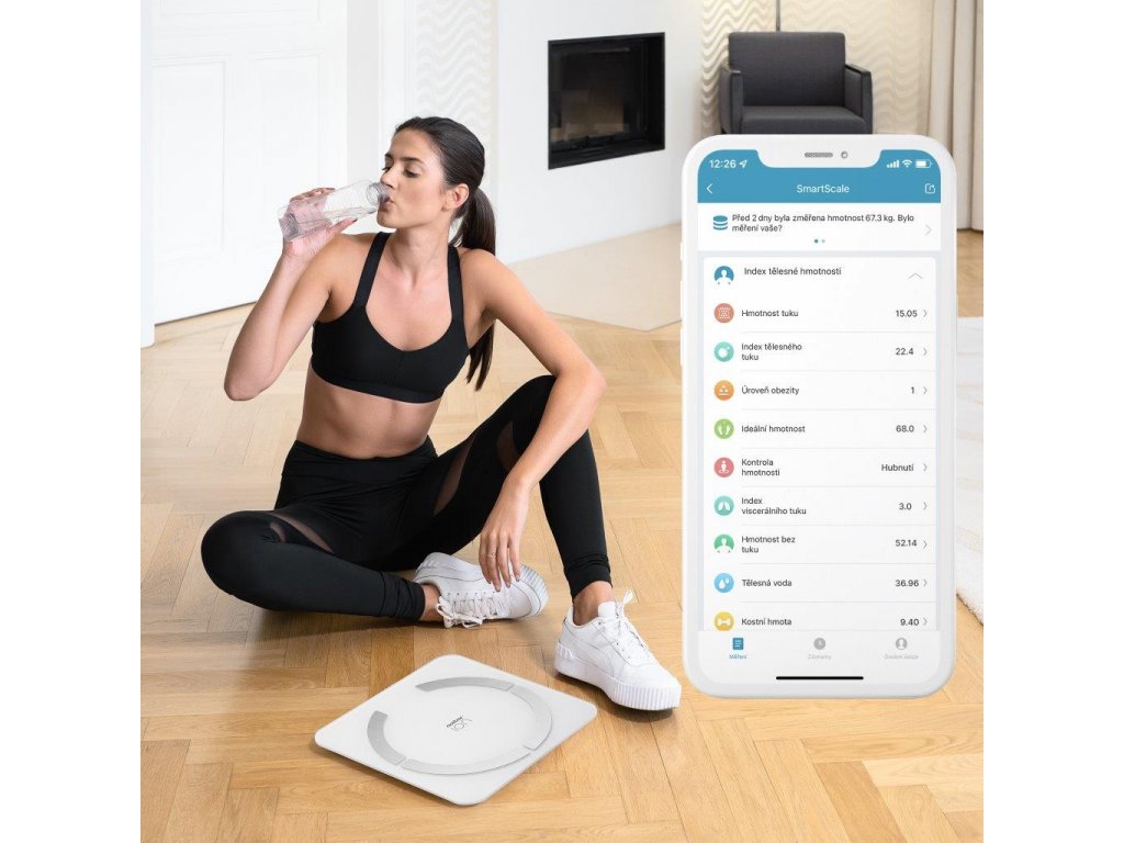 Analyzuje dvanáct tělesných parametrů včetně BMI, tuku a dalších