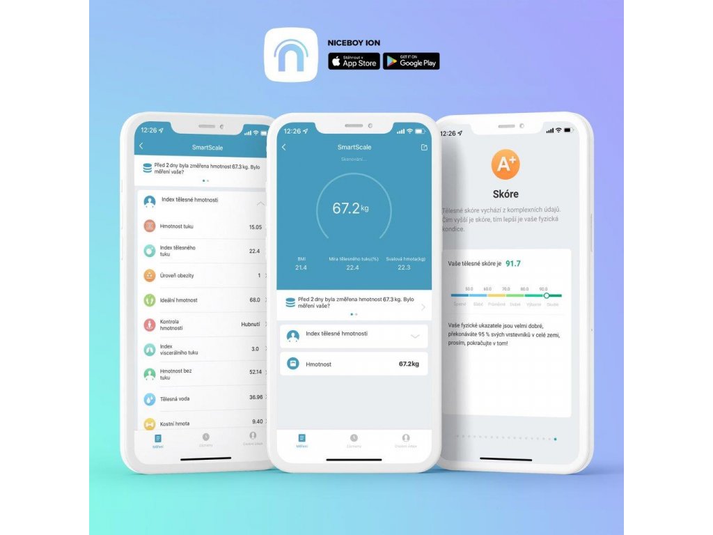 Pouhá hmotnost není pro představu o tělesné kondici dostačující. Pro přesnější obraz je potřeba znát i další parametry. A přesně ty vám dodá chytrá váha Niceboy ION SmartScale. Kromě tělesné váhy dokáže analyzovat jedenáct dalších parametrů včetně množství tuku či svalové hmoty, metabolického věku, BMI. S takto komplexním pohledem budete mnohem lépe vědět, jakým způsobem případně upravit svoji životosprávu.